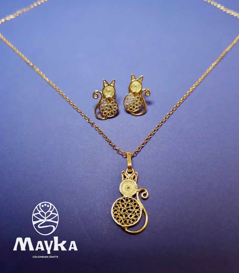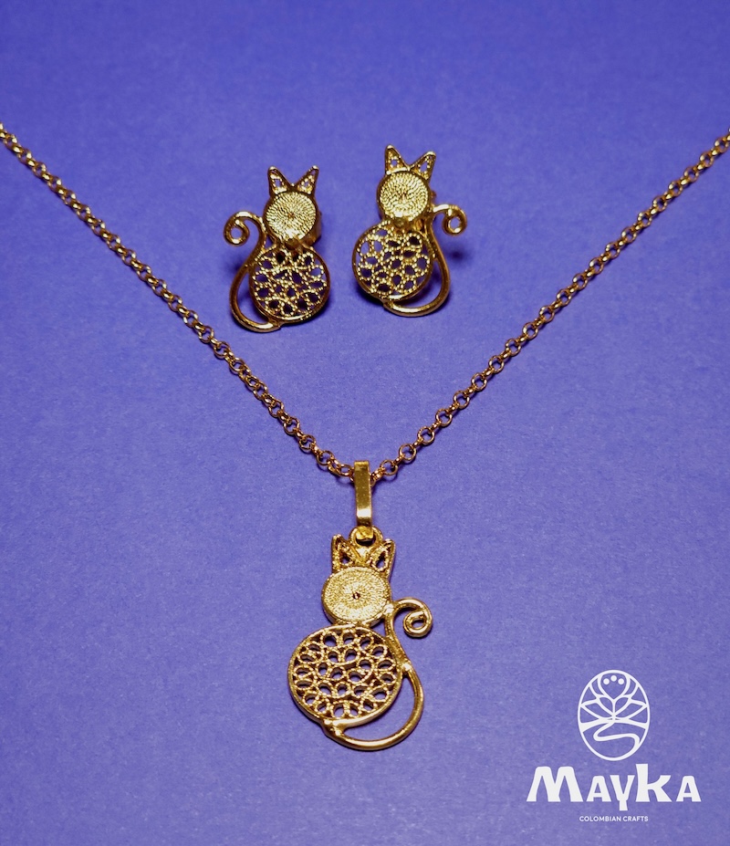 Este set es un testimonio de la pasión de MayKa por el detalle y el arte. Cada pieza de este conjunto (Cadena, Aretes y Dije de Gato ) ha sido cuidadosamente elaborada para asegurar su cohesión y exclusividad.
